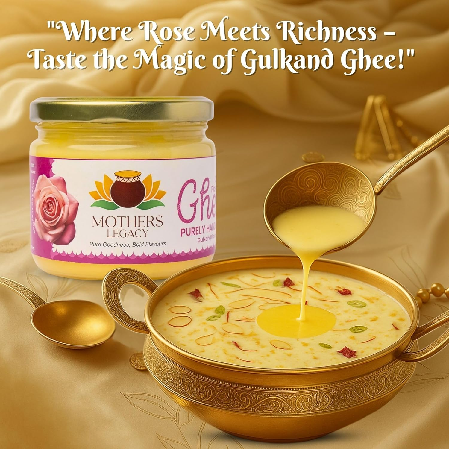 Experience the rich taste and wholesome goodness of Mother Legacy Pure Organic Ghee, crafted from the milk of grassfed desi cows. This 250-gram jar features ghee infused with the natural floral sweetness of organic Gulkand, combining traditional Indian flavors with health benefits. Free from additives and preservatives, this ghee is perfect for cooking, Ayurvedic wellness, and enhancing your daily diet with pure nourishment. Sustainably sourced and traditionally prepared, Mother Legacy Ghee brings you the wholesome essence of nature in every drop.