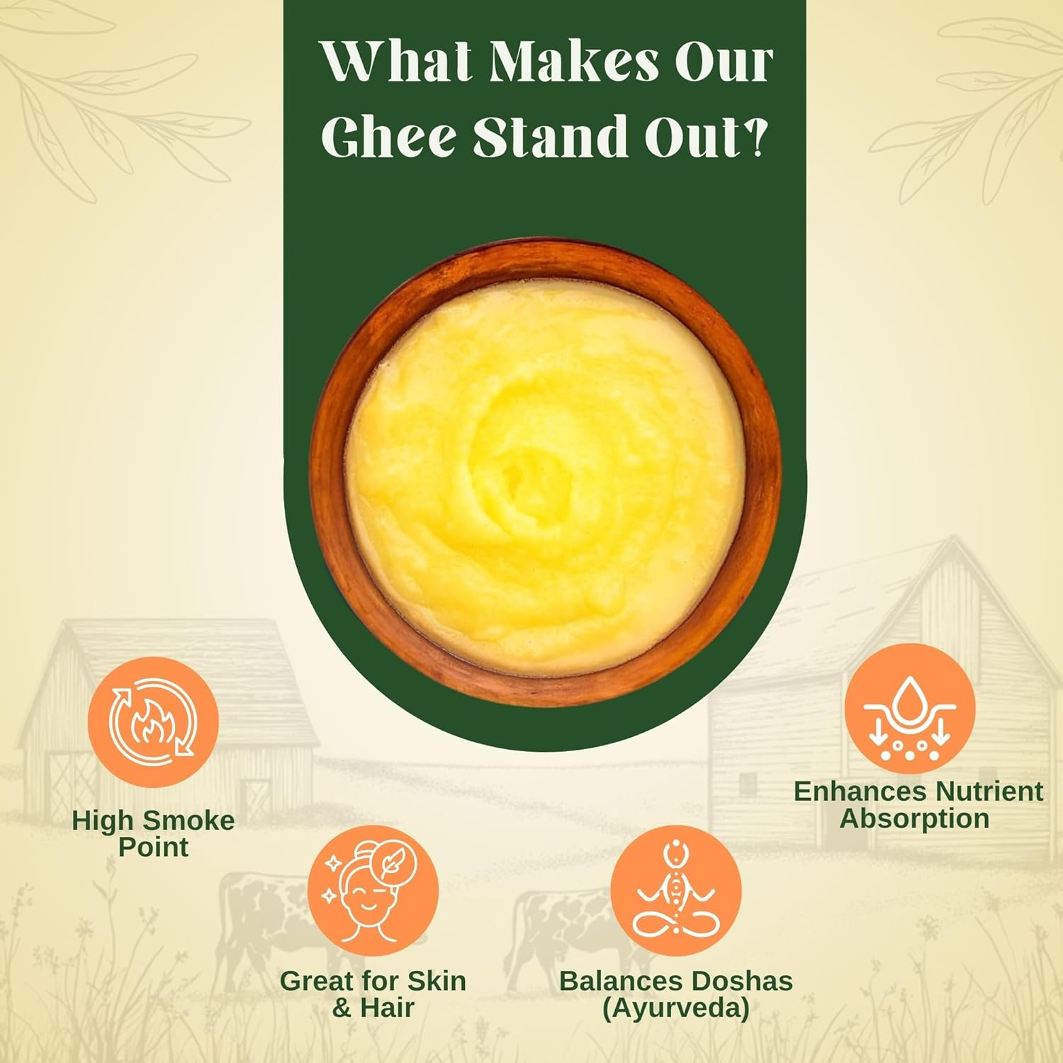 Pure organic ghee made from milk of grassfed desi cows using traditional curd-churning methods