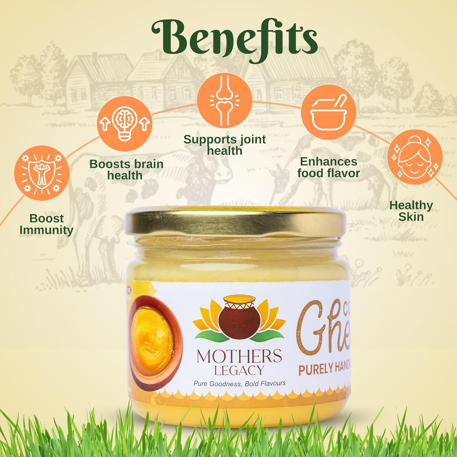 Mother Legacy Pure Organic Ghee is crafted using time-honored traditional curd-churning methods with milk from grassfed desi cows. This 250ml jar contains pure, unflavored ghee that preserves the authentic taste and nutritional benefits of natural dairy fat. Free from artificial additives or preservatives, this ghee is rich in healthy fats, antioxidants, and vital nutrients that promote digestion, immunity, and overall wellness. Ideal for cooking, Ayurvedic practices, or daily dietary supplementation, it embodies the essence of purity and health in Indian culinary tradition.